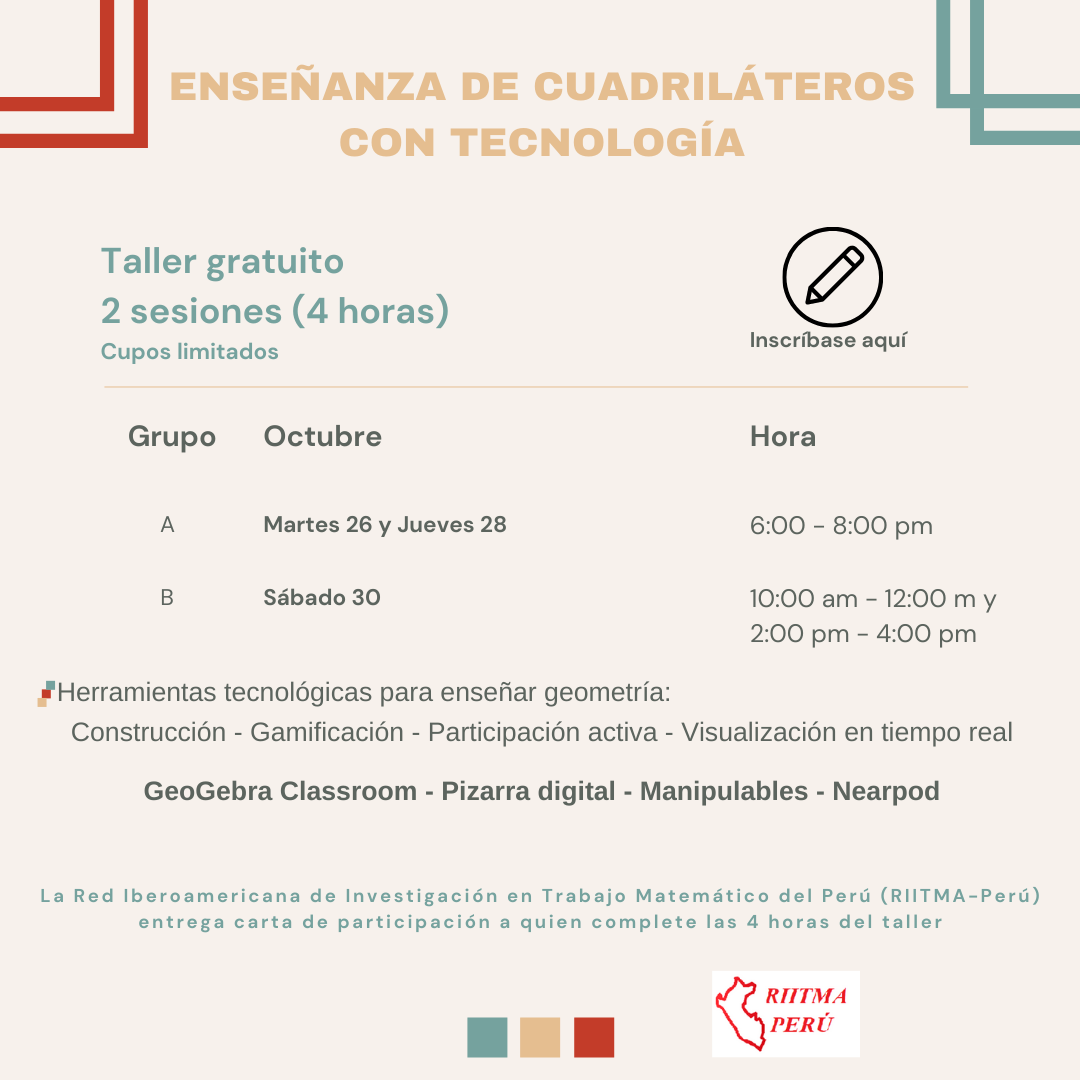 TALLER: ENSEÑANZA DE CUADRILÁTEROS CON TECNOLOGÍA. Martes 26 y jueves 28 (6:00-8:00pm) Inscripción: https://forms.gle/HqPb247E8NYgJsJR6